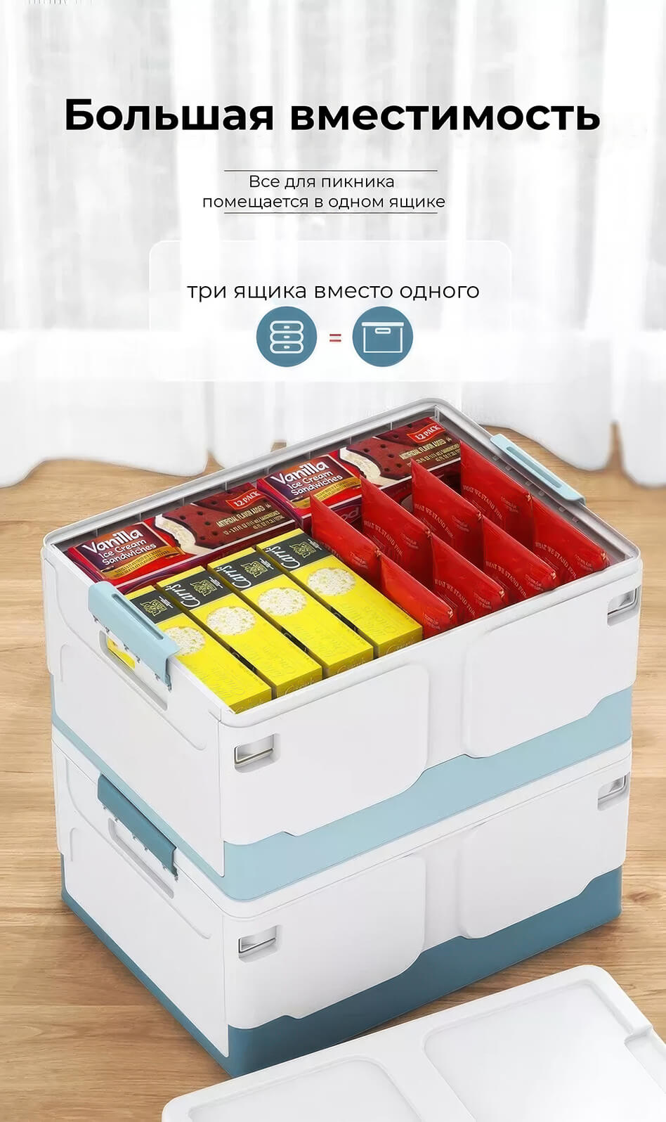 Этот пластиковый складной ящик сочетает в себе прочность, функциональность и современный дизайн. Белые стенки придают ощущение чистоты и простора, а синее дно добавляет глубины и элегантности, создавая гармоничное сочетание. Пластиковый контейнер идеально подходит для хранения одежды, игрушек, документов, мелочей и бытовых принадлежностей.